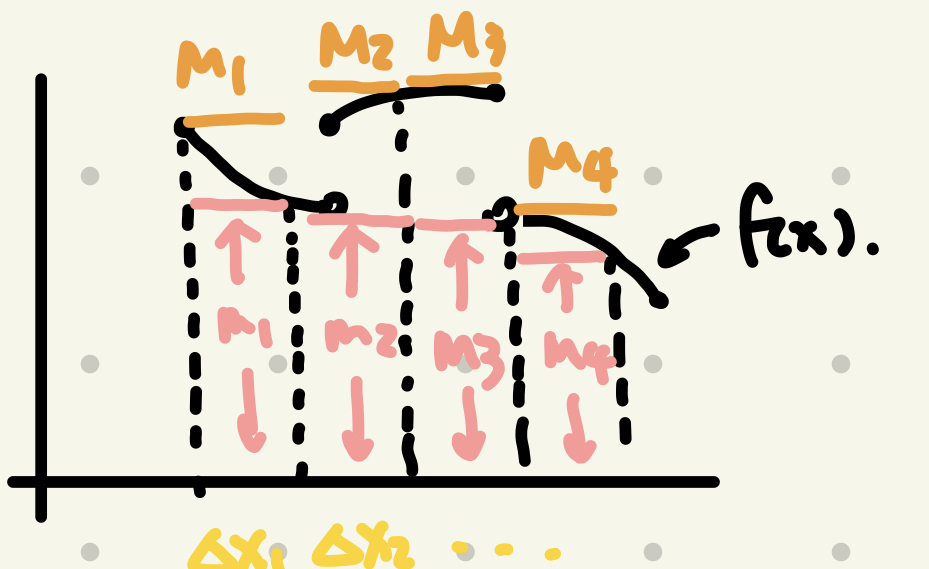 • Riemann Integrable: We say a function $f$ is Riemann integrable if $U(f)=L(f)$,