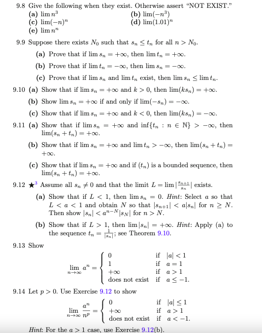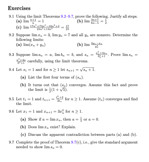 First, we will get familiar with a few examples of convergent and non-convergent sequences. Then, we prove a few properties on convergent sequence, first, they are bounded; second, they can only converge to a single value. Then, we will prove some operations (+,-,/, etc) on convergent sequence. Finally, we prove a few useful examples of limit (Thm 9.7). See also notes from previous semester