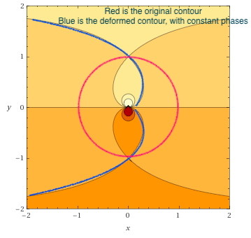 2. Massage our contour so that they pass through the critical point. Yes, it does, since our contour is the unit circle $|u|=1$.